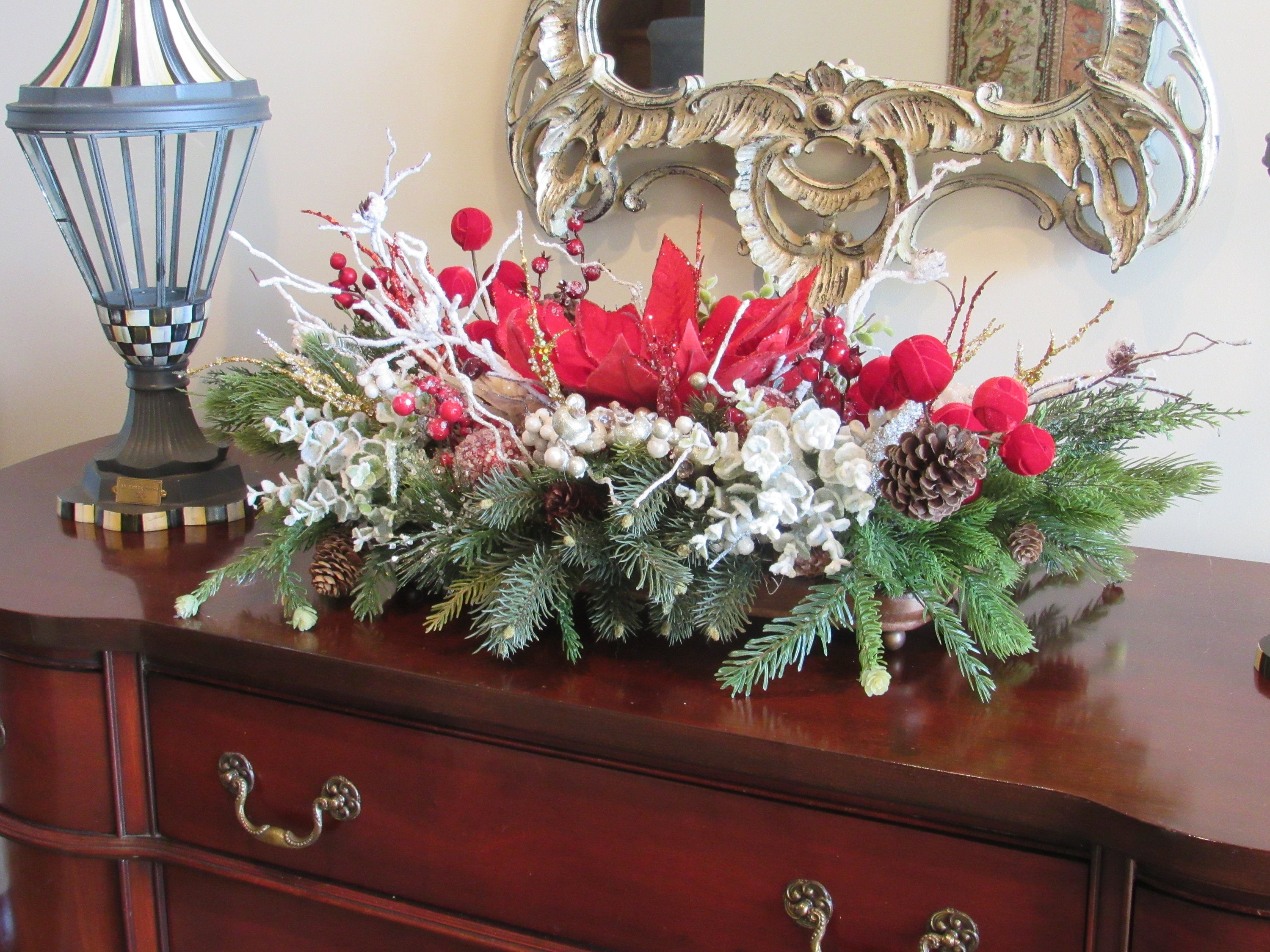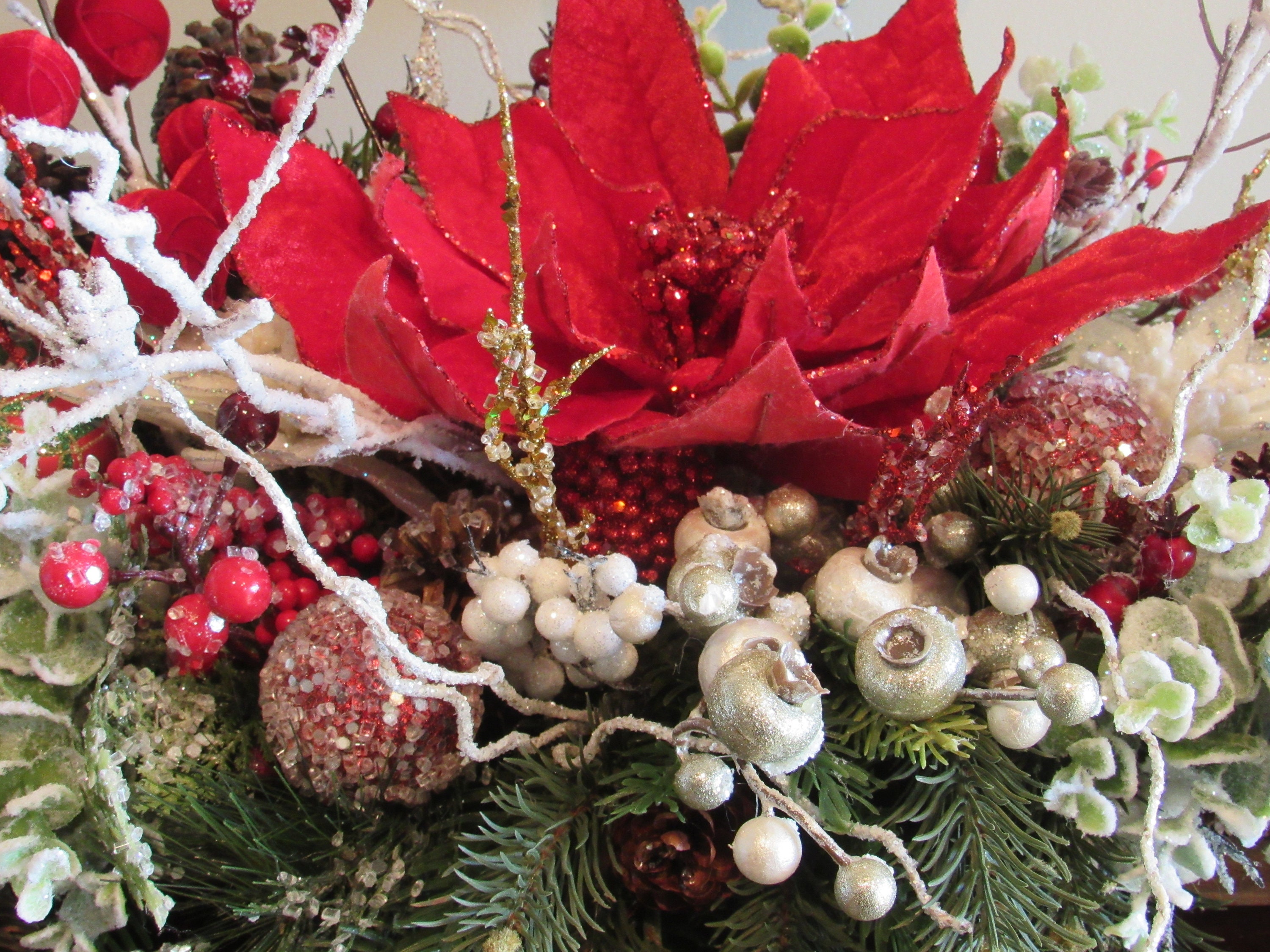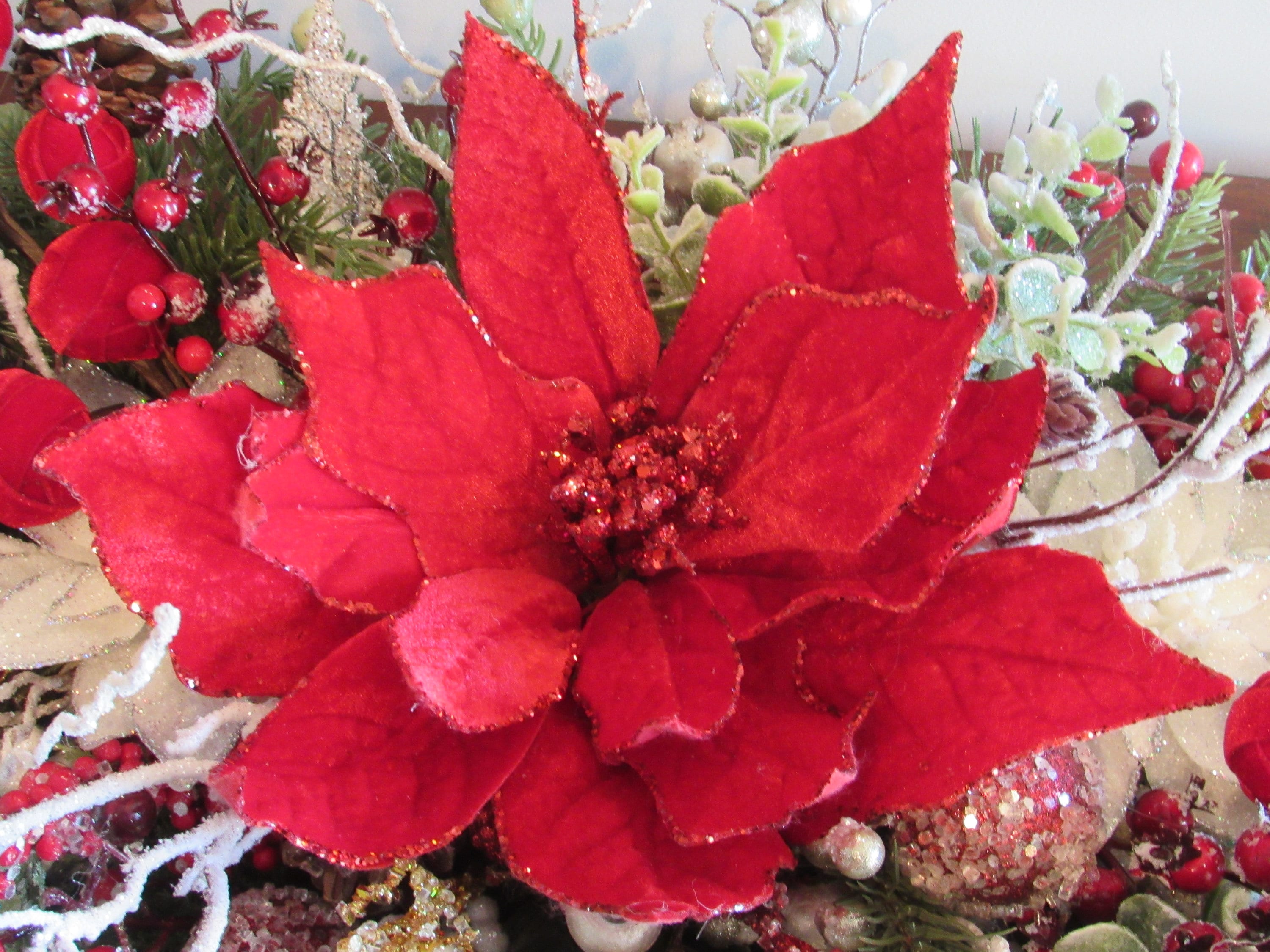 Christmas Elegance Designer Poinsettia Centerpiece, Table Décor, Evergreen, Red Berries, Buffet decoration