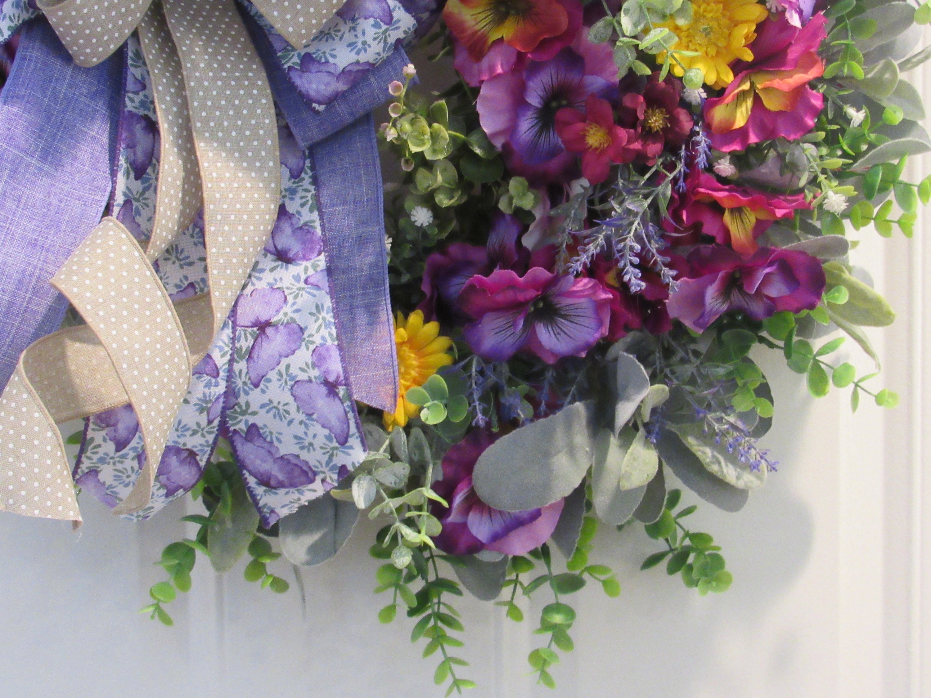 Designer "Grandma's Pansy Garden" Silk Floral Wreath with 3 coordinating ribbon Hand fashioned Bow, Spring Wreath, Entry Sunroom Wreath