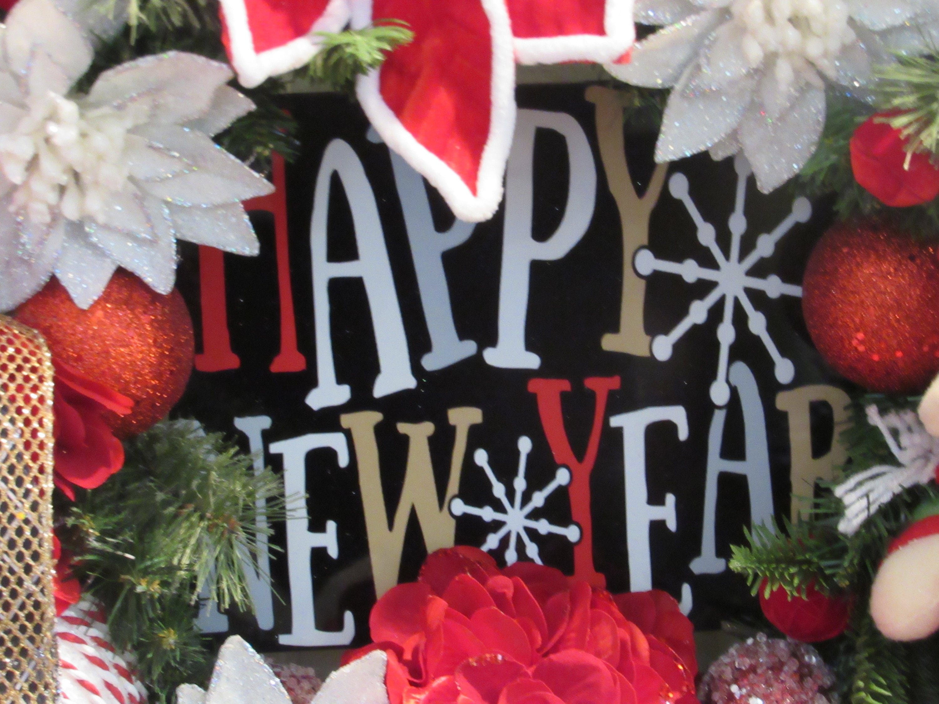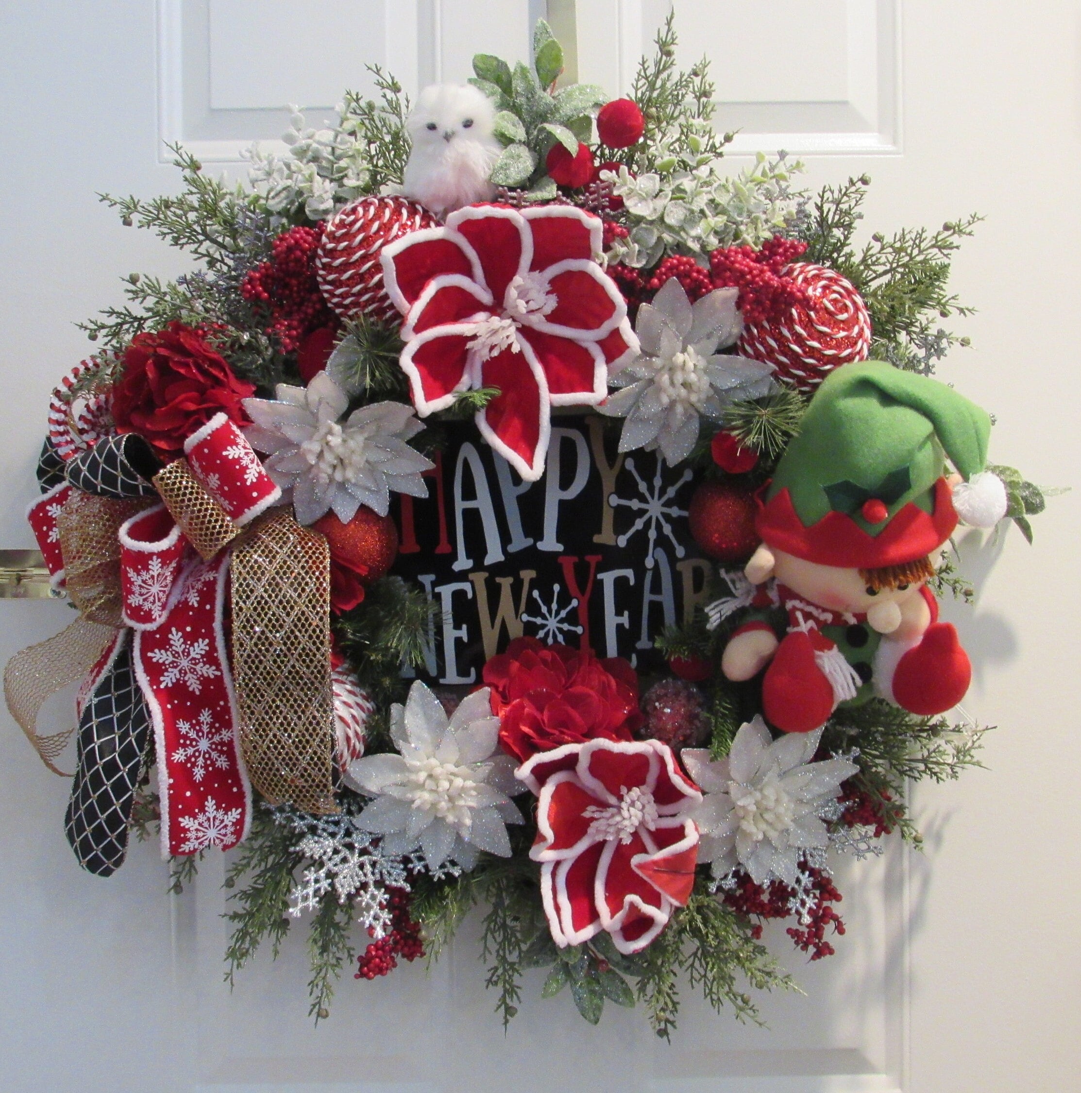 Designer "Elf and Owl's Happy New Year" Door Wreath, Fireplace Wreath with Hand Fashioned Bow. Christmas Wreath. Restaurant Decor'