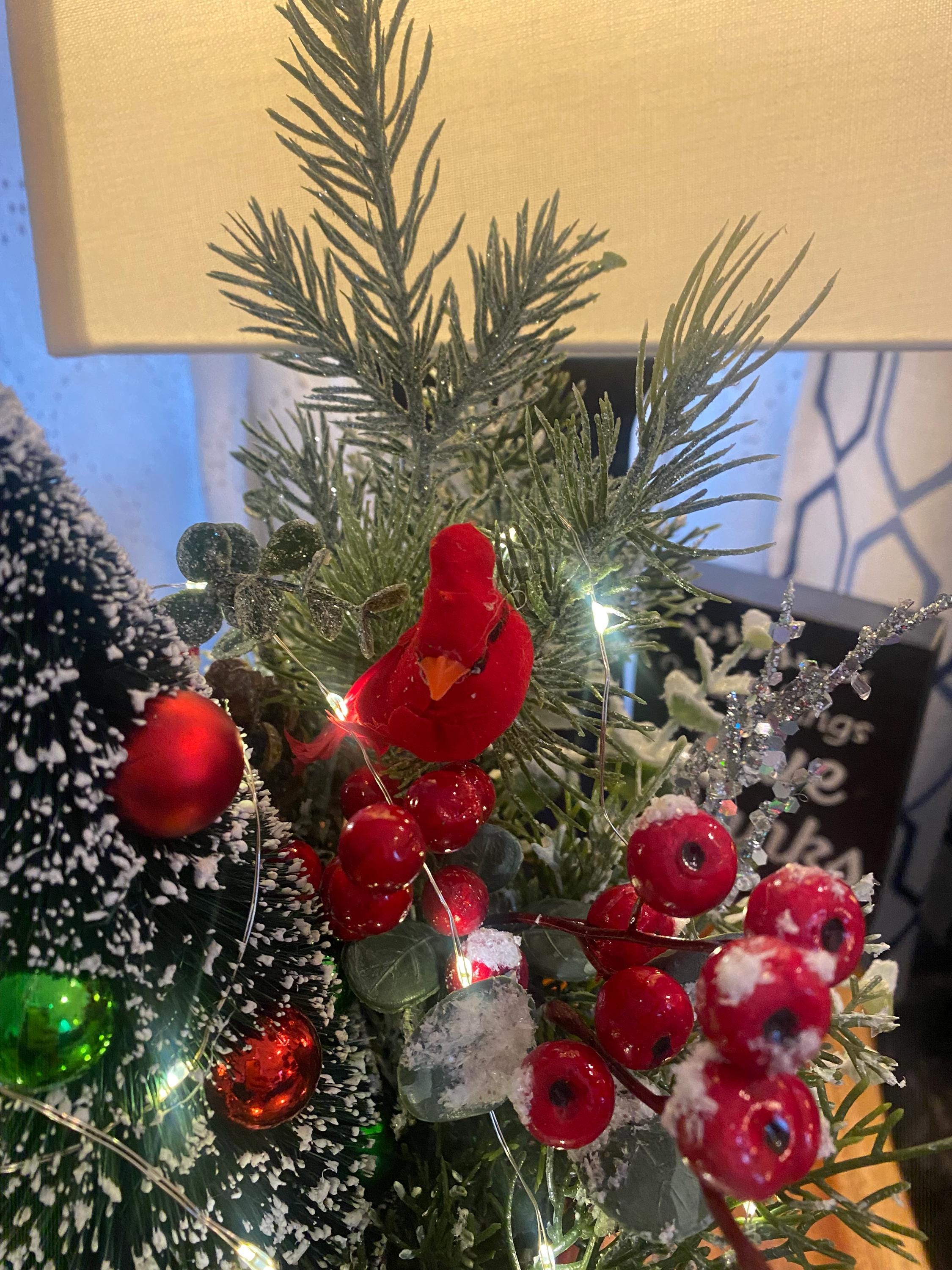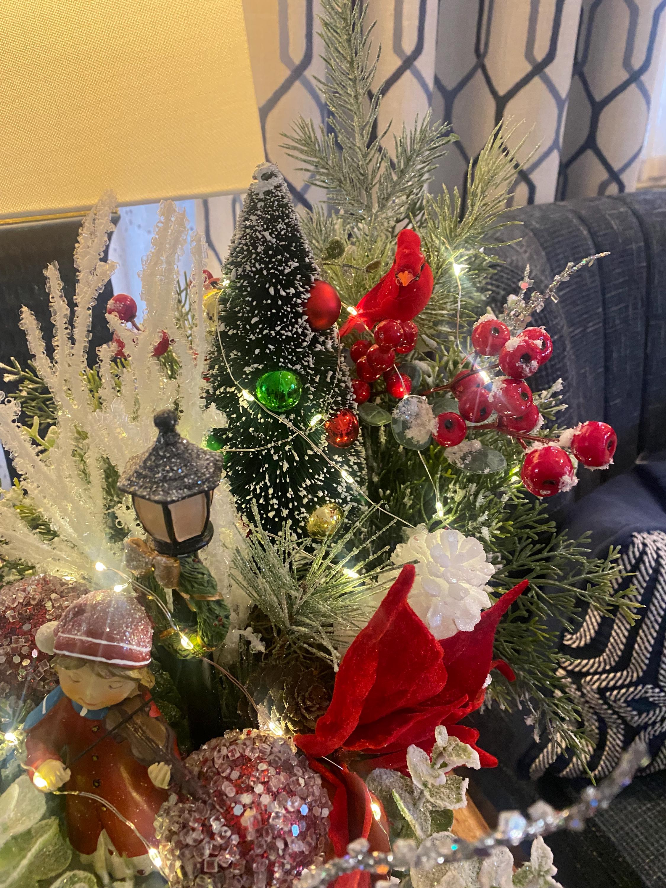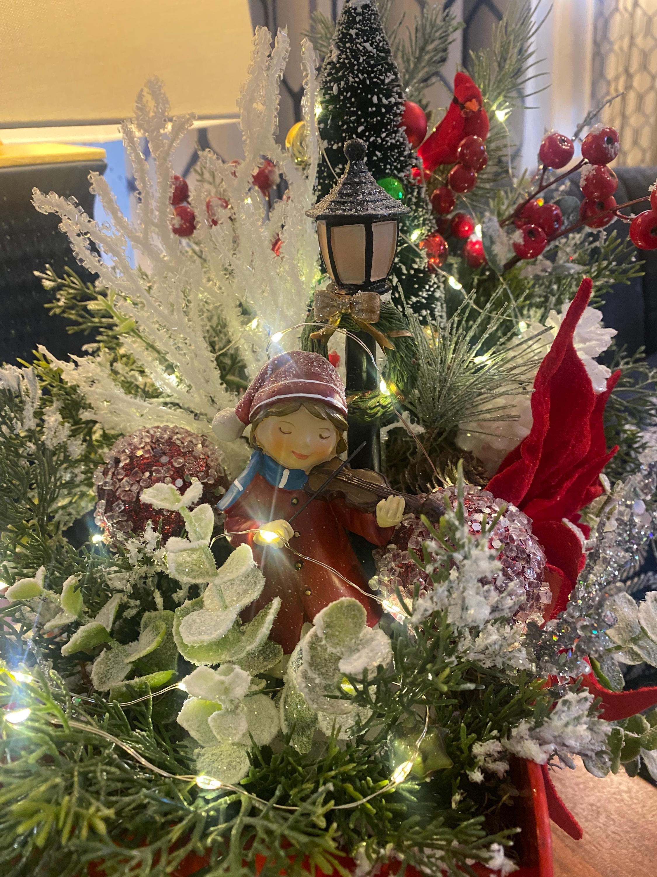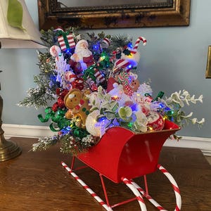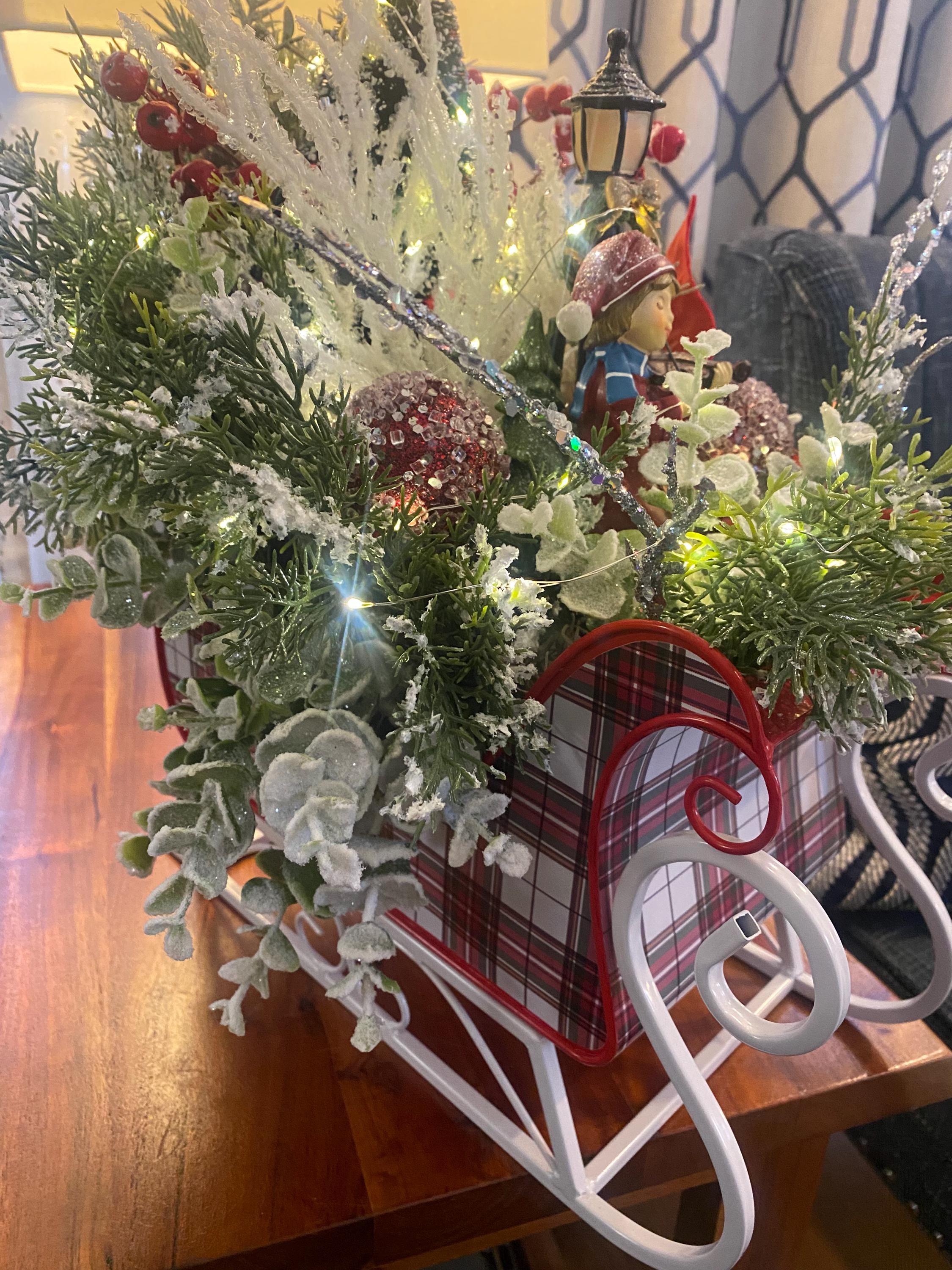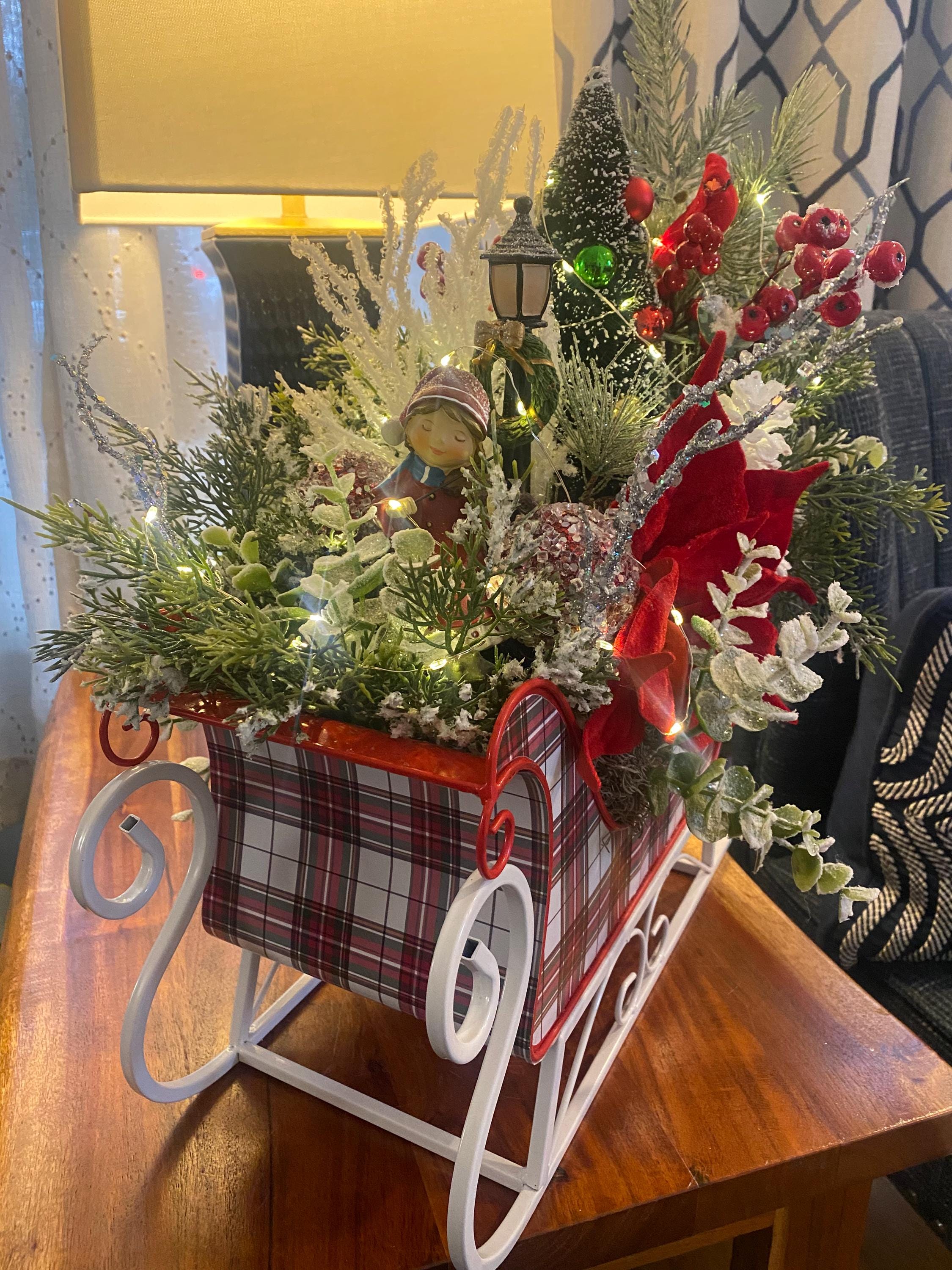 Lighted Christmas Sleigh with Plaid Pattern, Girl and Lamplight Figurine, Christmas Tree