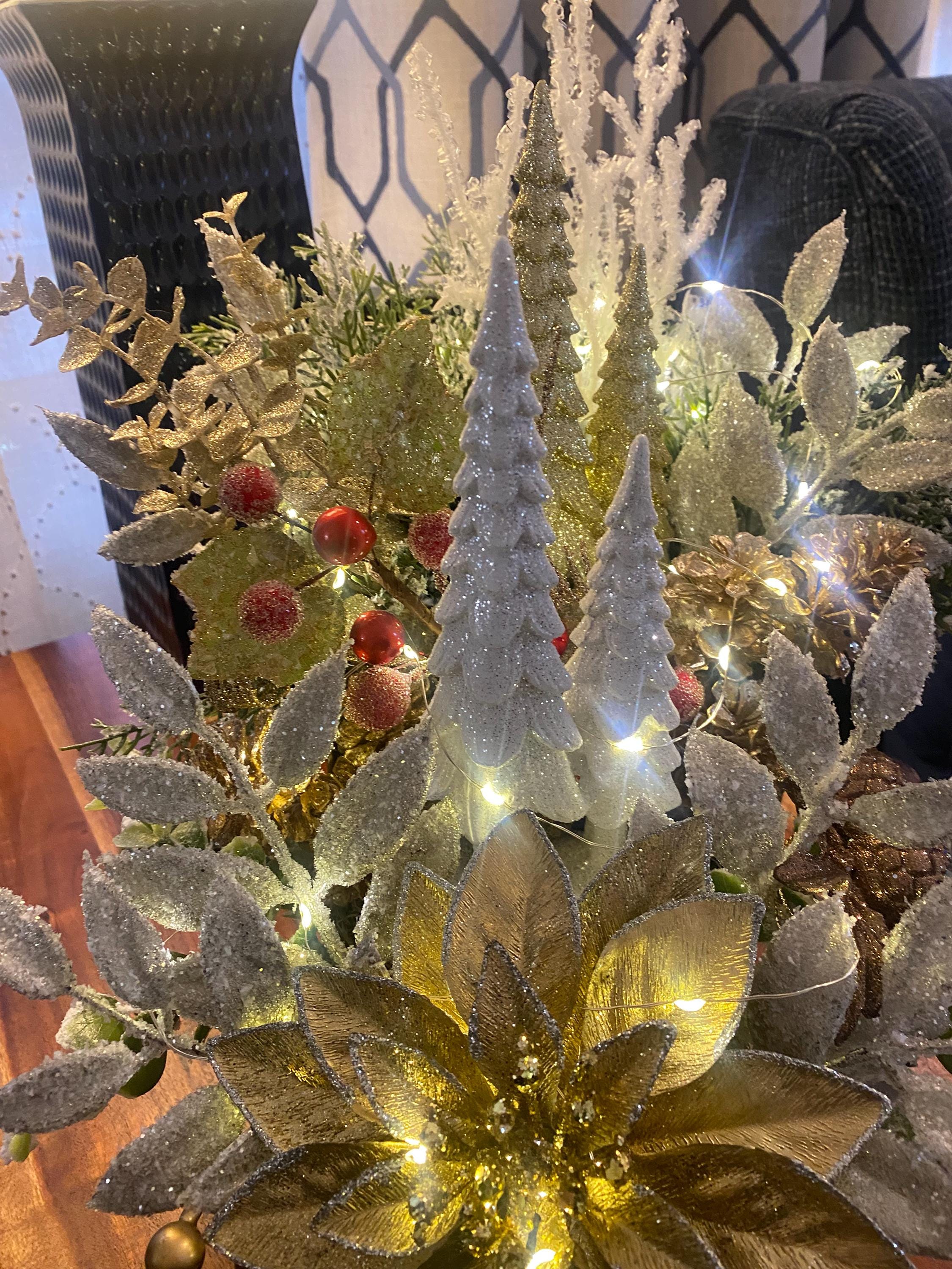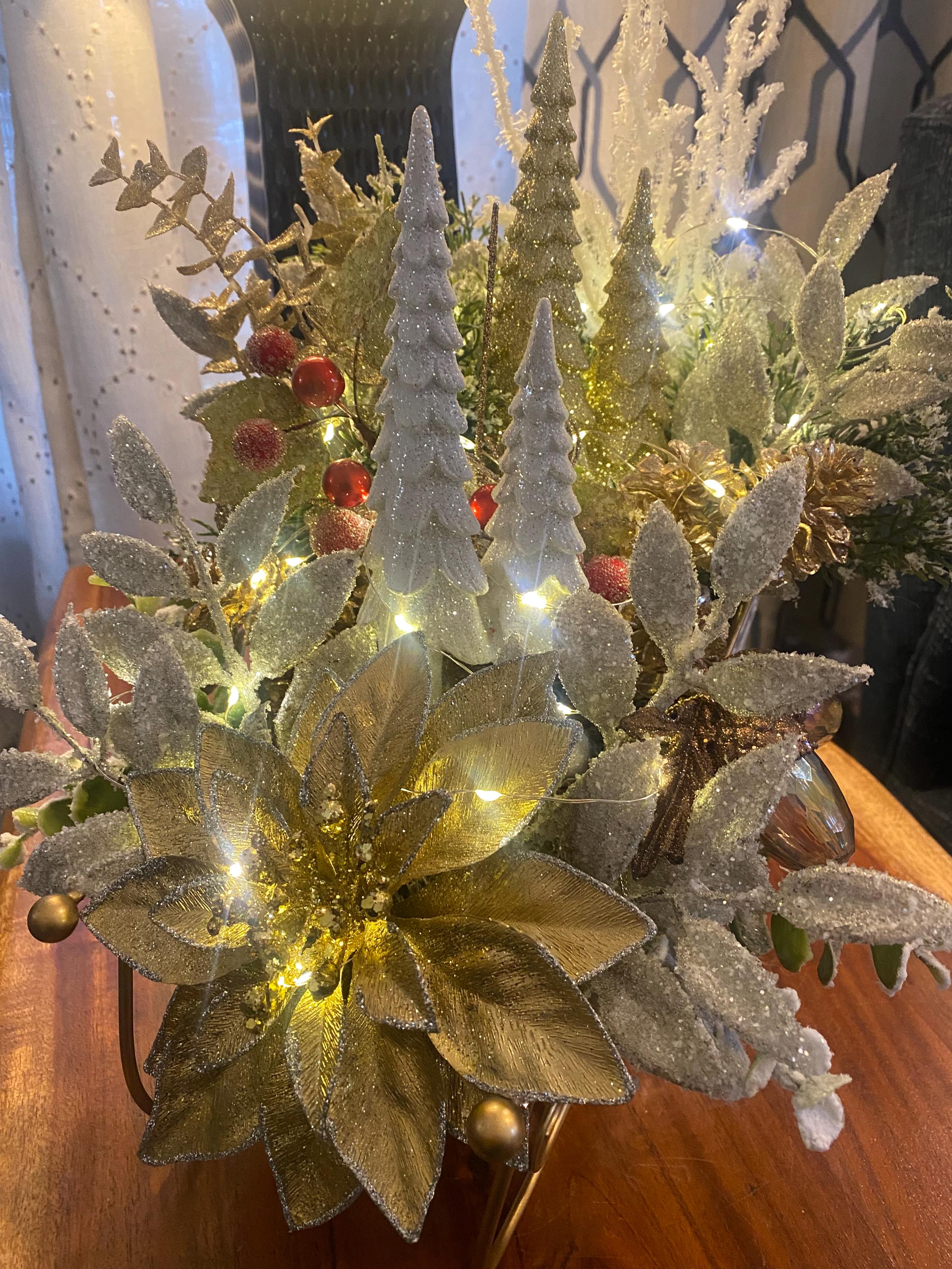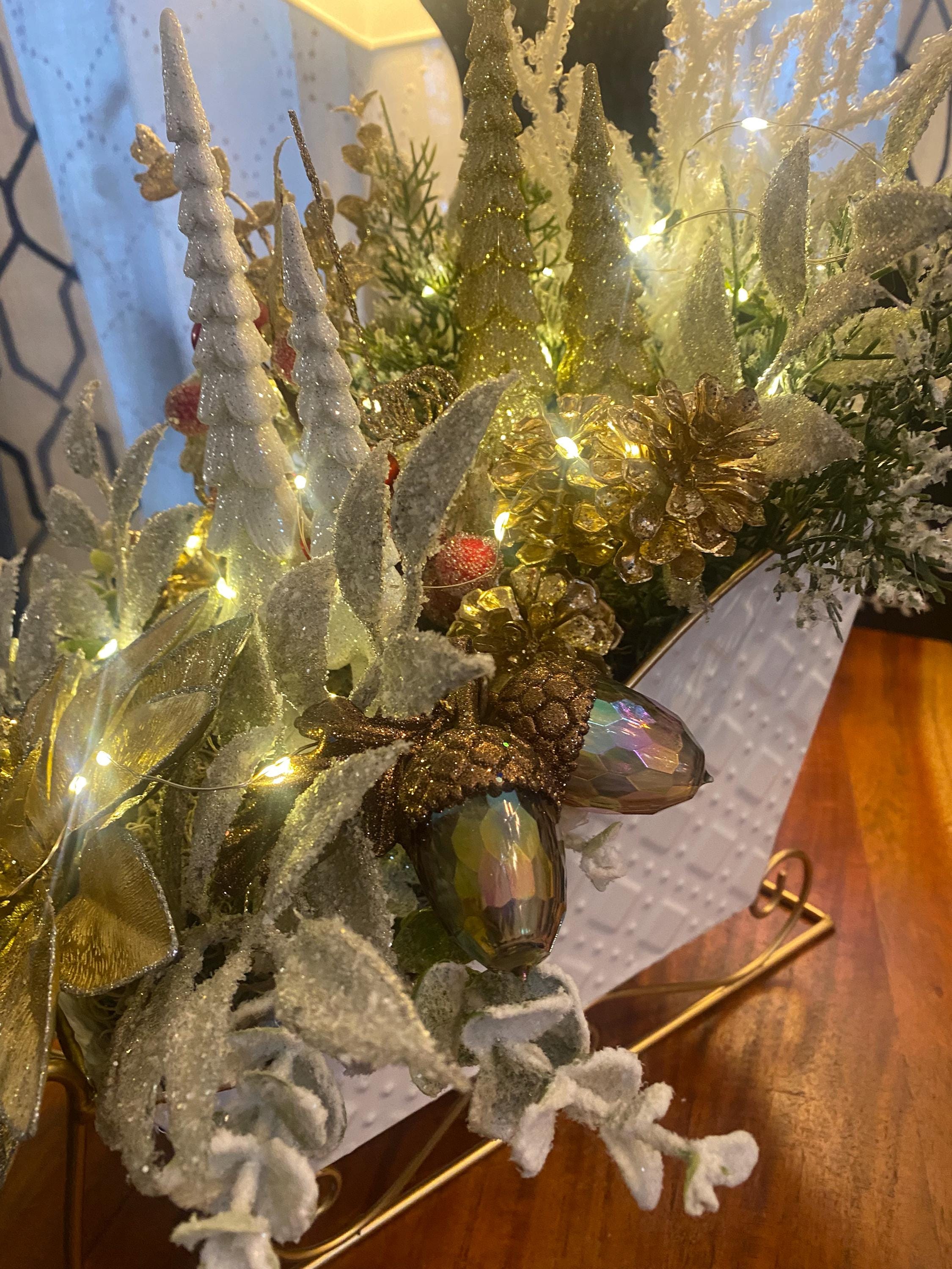 Classic Lighted White and Gold Christmas Sleigh, Traditional Mountain Landscape, Stunning Reflecting Multi Color Glassy Acorns an Evergreen trees. This stunning piece will be beautiful in your home.