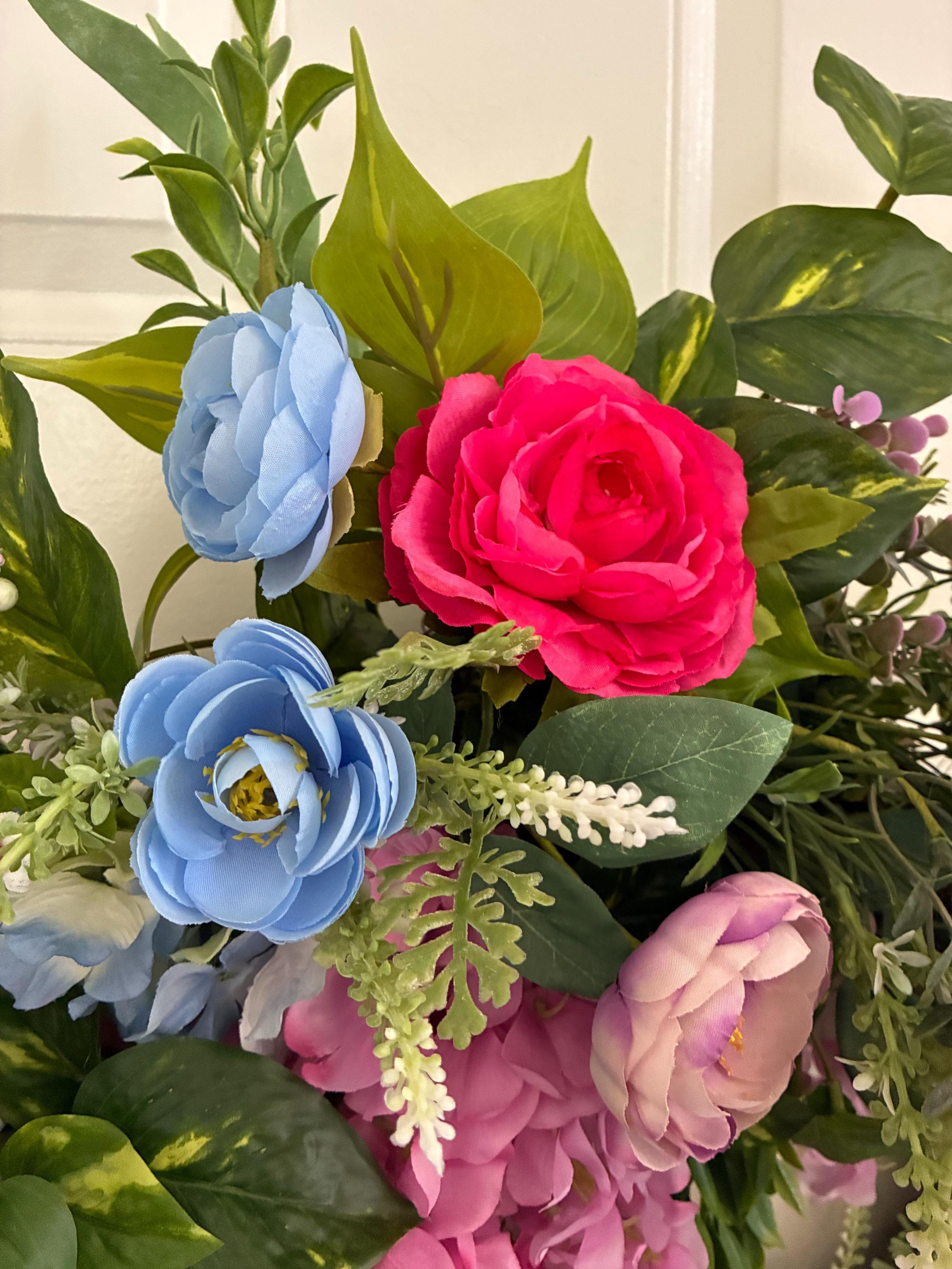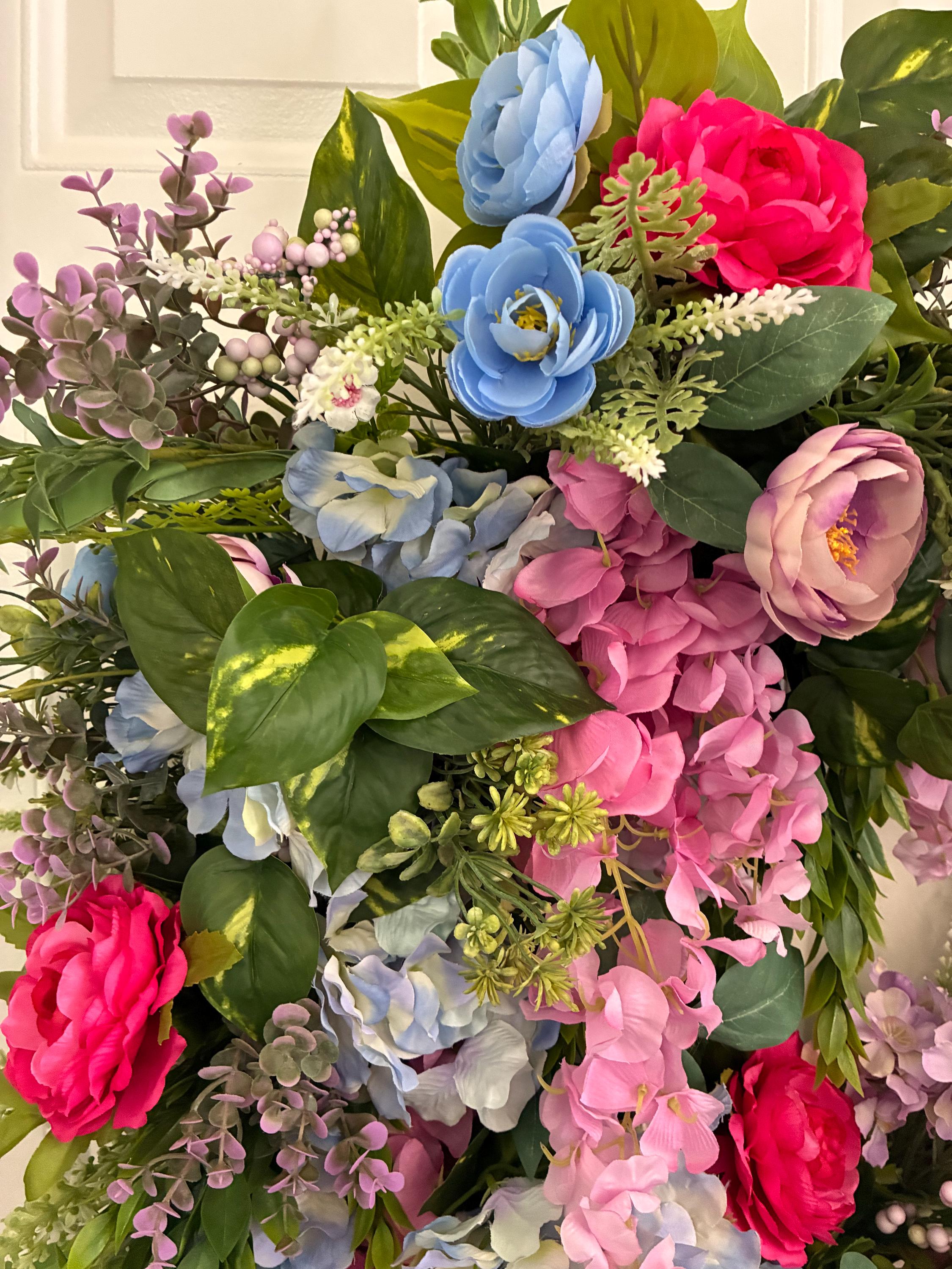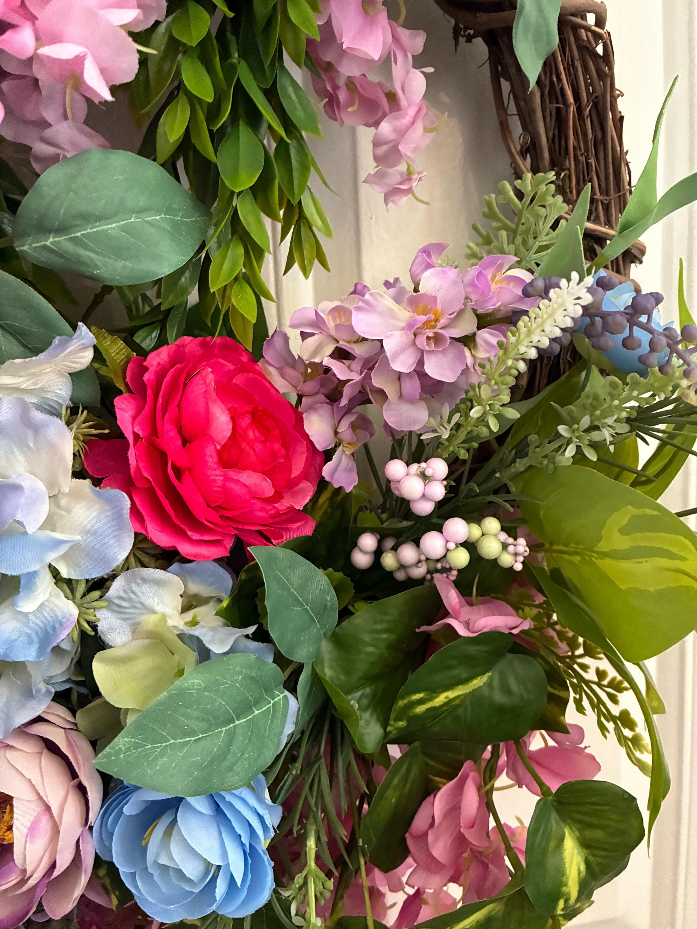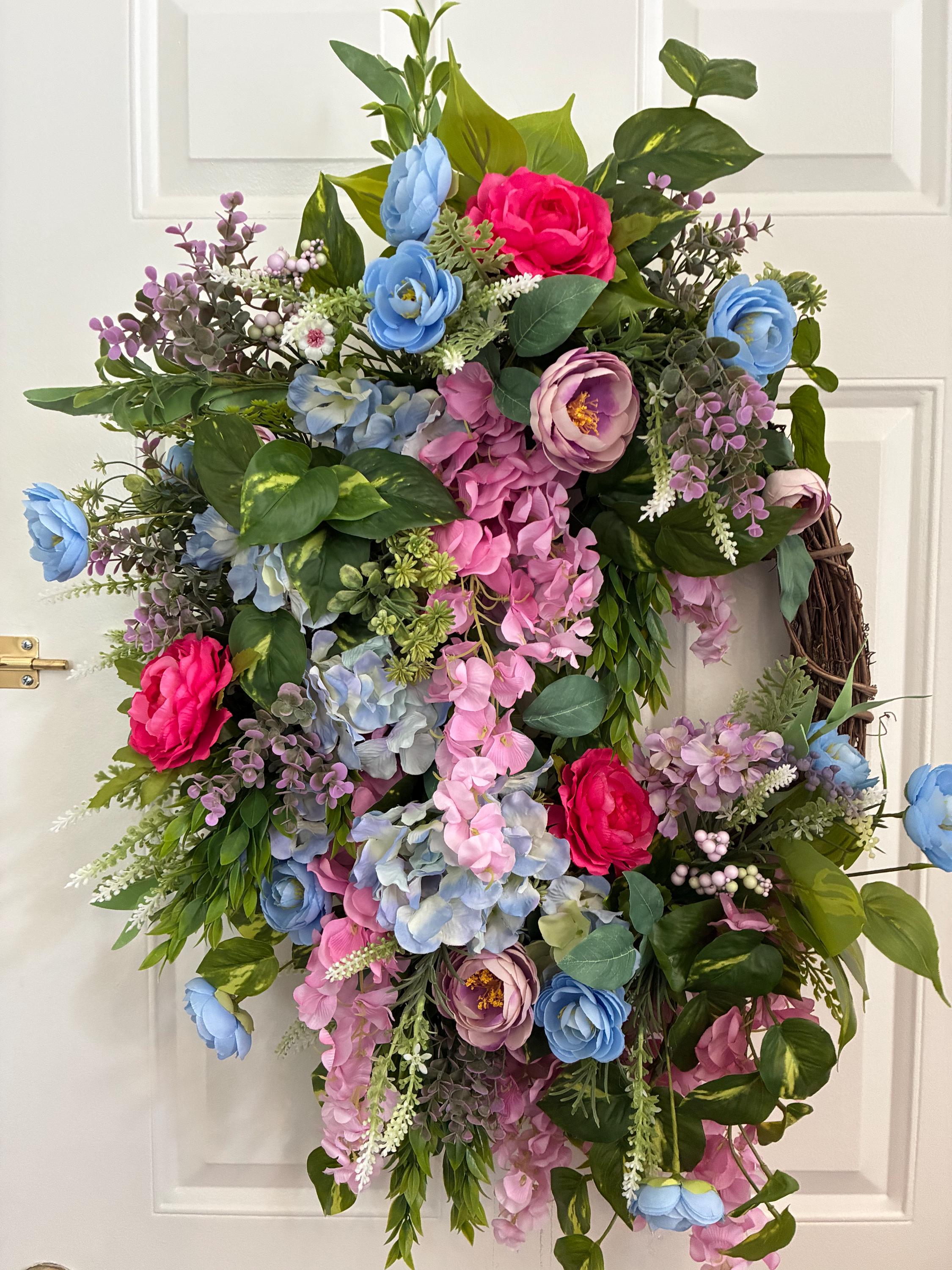 Designer Garden Door Wreath, Porch Wall Decor, Grapevine Base, Faux Flowers