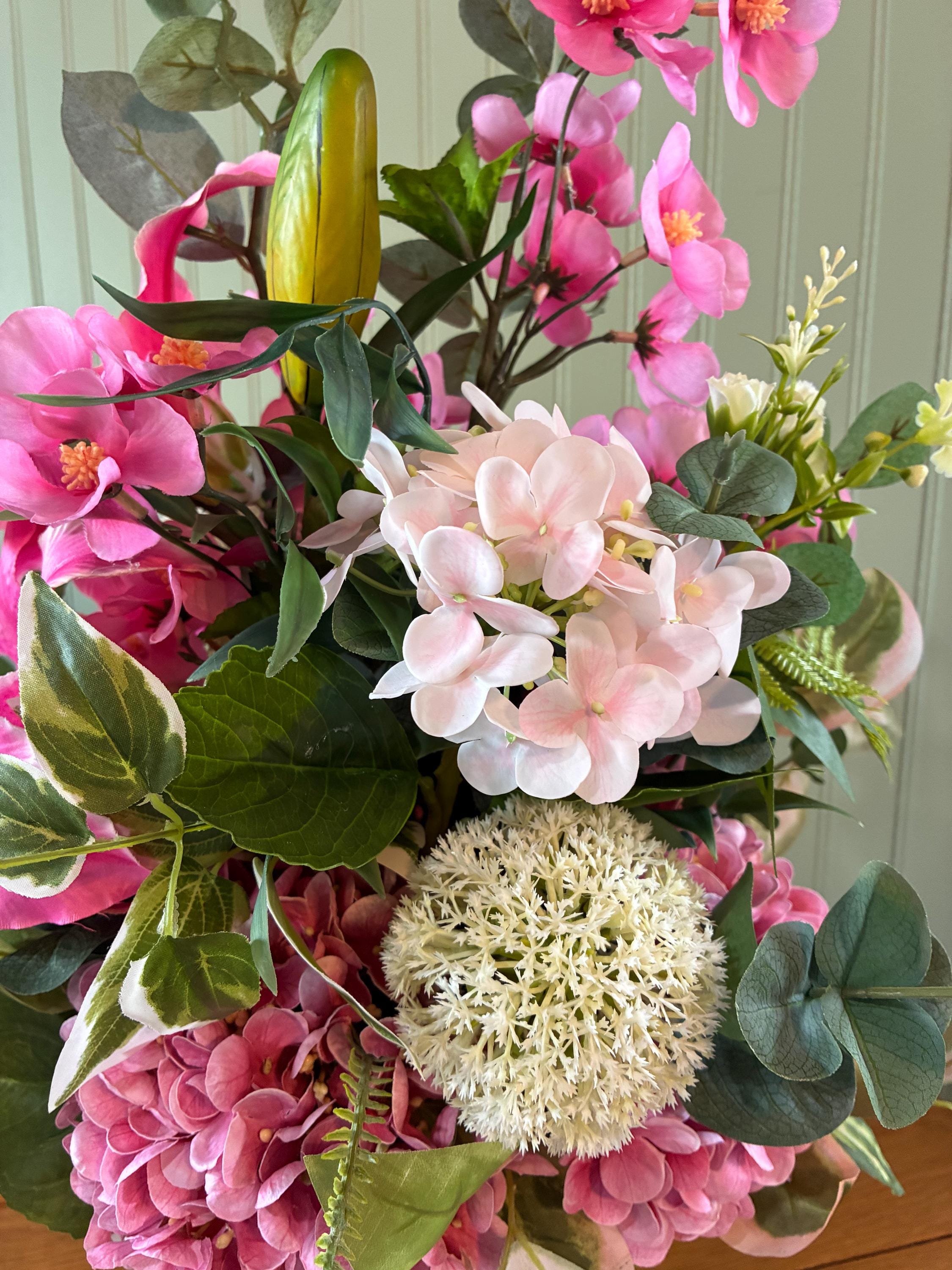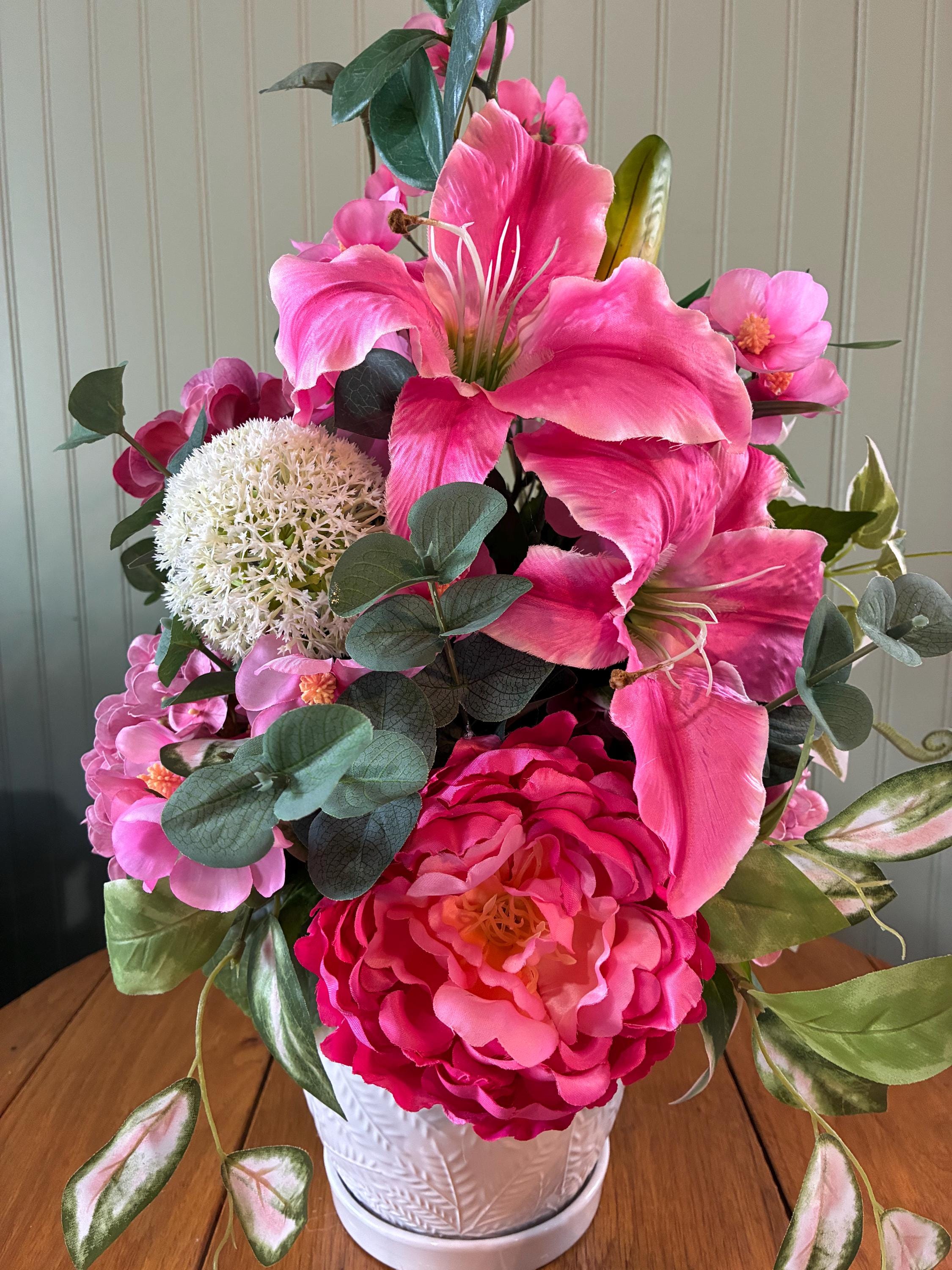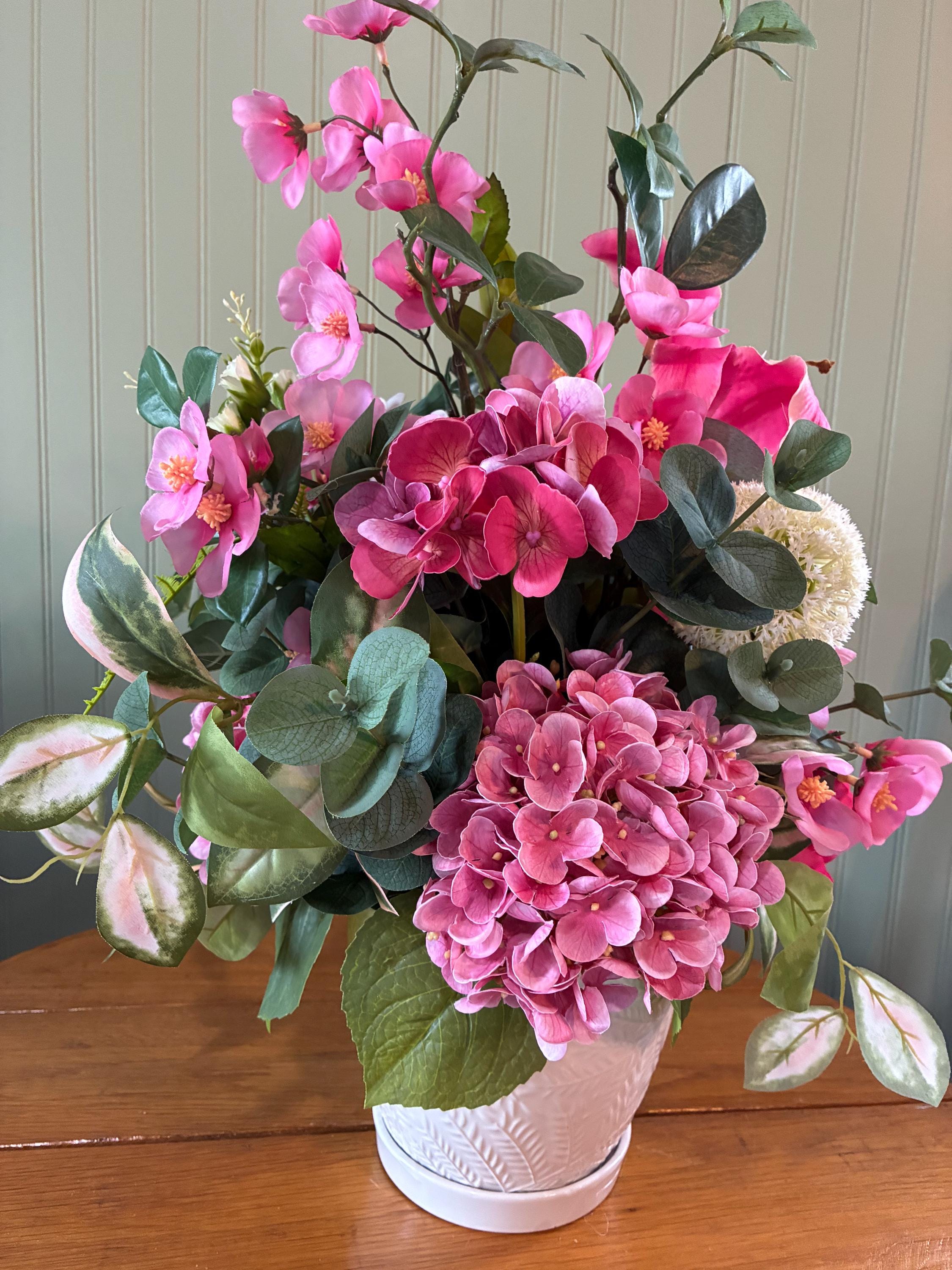 Elegant Hydrangea and Orchid Centerpiece table decor in Ceramic container
