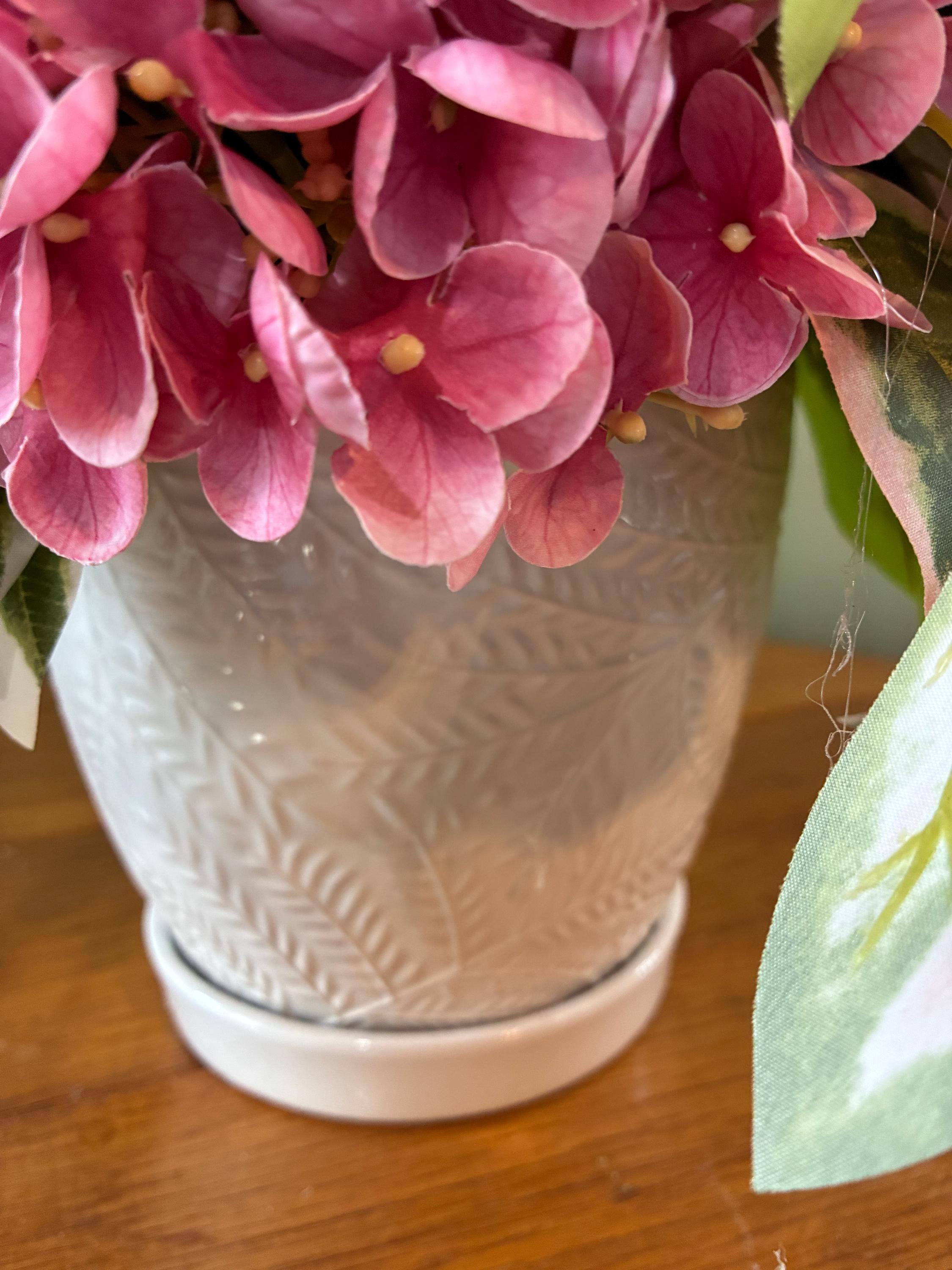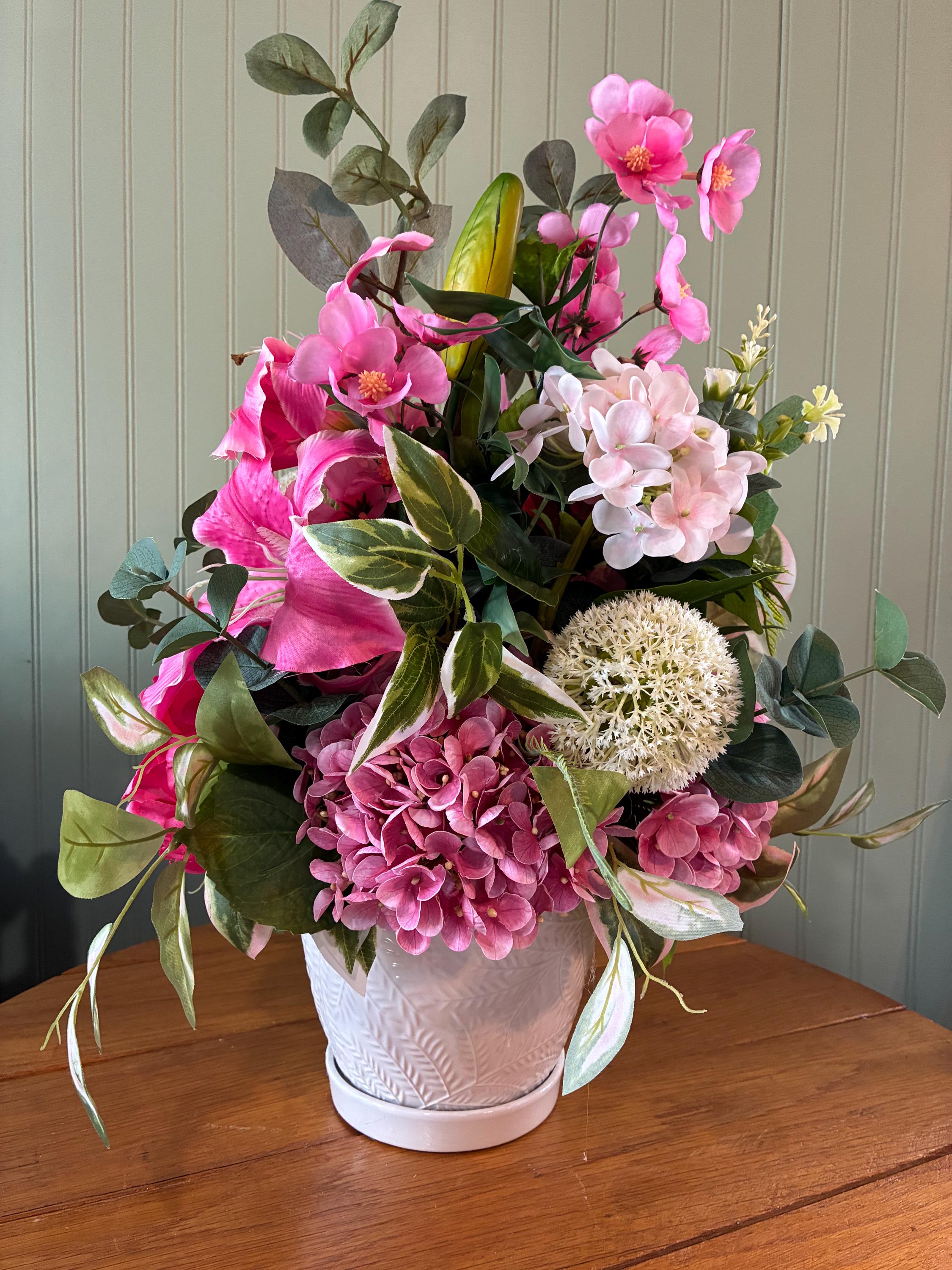 Elegant Hydrangea and Orchid Centerpiece table decor in Ceramic Container
